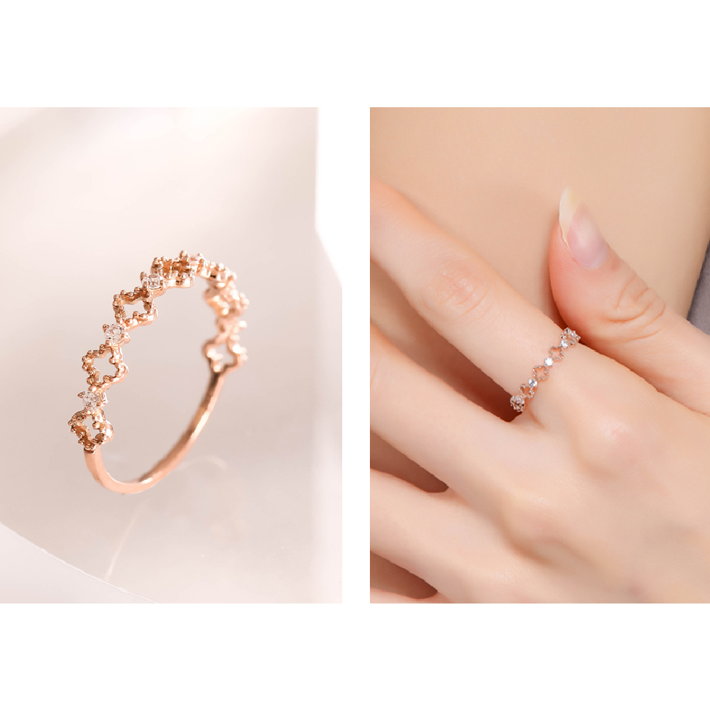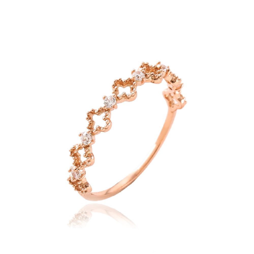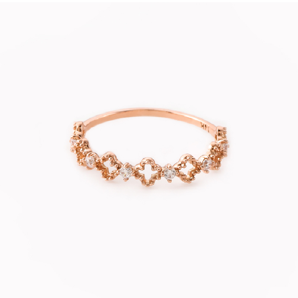 버블 볼로 플로럴한 매력을 불어넣은 네잎클로버 장식 사이사이에 큐빅을 셋팅하여 생동감과 뭉금뭉금한 감서을 살린 반지 입니다.