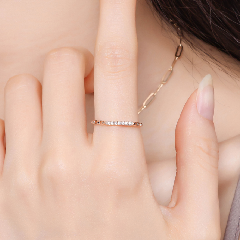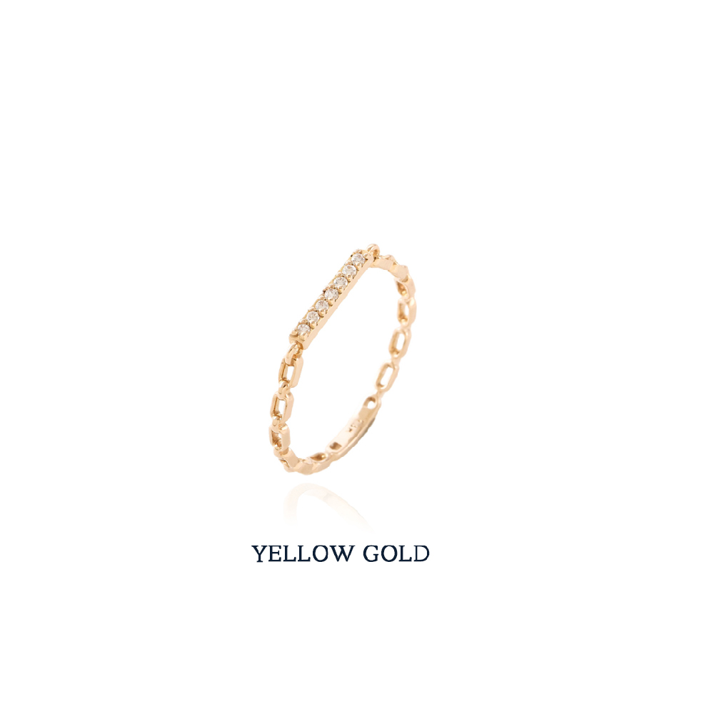 시크한 매력의 고정형 체인 반지에 슬림한 직선 큐빅 스킨을 메인 유닛으로 배치하여 유니크하고 세련된 디자인을 ㅗ완성된 반지입니다. 도시적이고 모던한 매력의 디자인으로 어떤 룩에도 잘 어울리는 데일리 반지입니다.